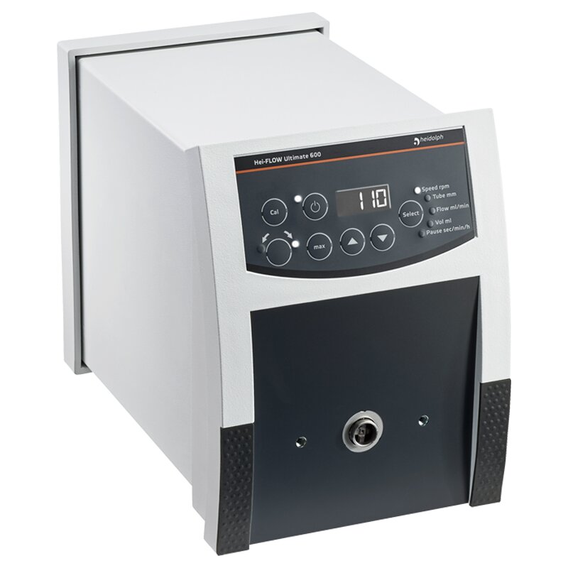 Hei-FLOW Ultimate är utvecklad för högprecisiondosering och dokumenterade processer, särskilt inom läkemedel, kosmetik och livsmedel. Med ett hastighetsområde på 5–120 rpm och en reglernoggrannhet på ±0,5 % ger den stabila och reproducerbara flödesförhållanden. Beroende på pumphuvud ligger flödesområdet kring 0,38–813 ml/min (enkelkanal) och 0,005–364 ml/min (flerkanal). Både analoga och digitala gränssnitt gör det möjligt att styra hastighet, riktning och start/stopp helt externt, och en valbar fotbrytare underlättar säker drift i stängda dragskåp. På själva enheten kan du ställa in hastighet, slangdiameter, flödesvisning, doseringsvolym, intervalldosering och paustider, samt kalibrera pumpen för bästa möjliga doseringsnoggrannhet – perfekt när du behöver spårbara och väldefinierade processförhållanden.