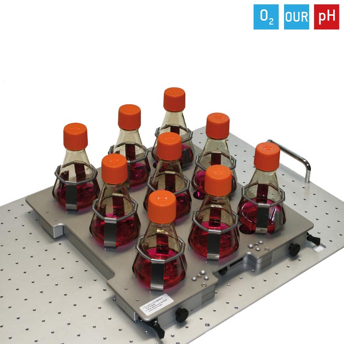 PreSens SFR Shake Flask Reader mäter pH, syre och OUR i upp till 9 E-kolvar, odlingsrör eller T-flaskor samtidigt. Den passar i nästan all standard skakutrustning.
